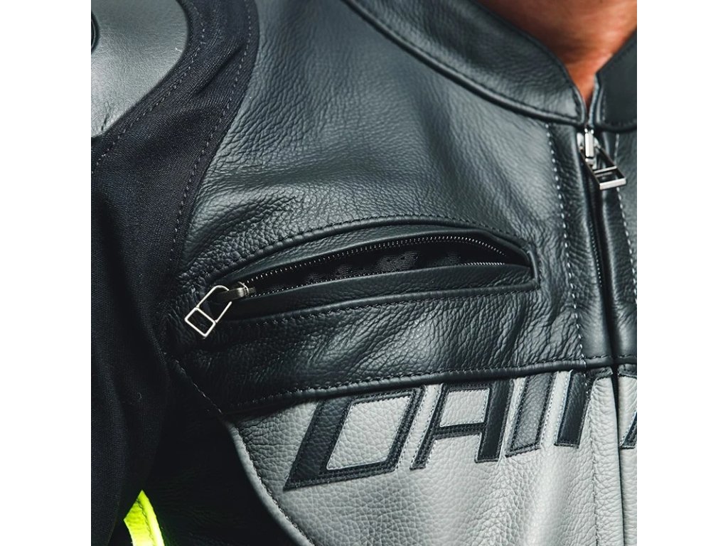 Dainese Motocyklová bunda Racing 4 je vybavená zips v spodnej časti,ktorý umožňuje jej spojenie s motocyklovými nohavicami,a kompozitné chrániče s certifikátom EN 1621.1 na lakťoch a ramenách,ktoré sú dodatočne chránené vymeniteľnými vonkajšími hliníkovými doskami – charakteristická technológia Dainese – navrhnutá,na podporu a uľahčenie posúvania v prípade pádu,vďaka tomu sa zabráni nebezpečnému riziku poranenia asfaltu.